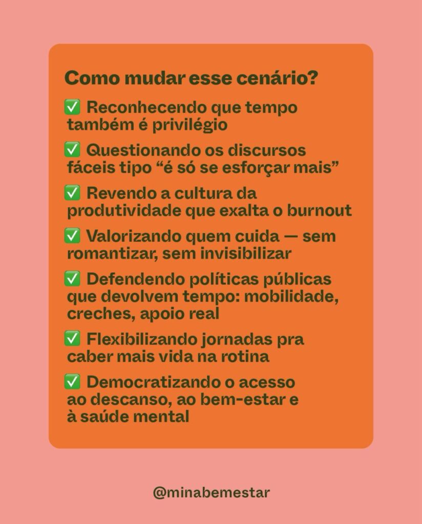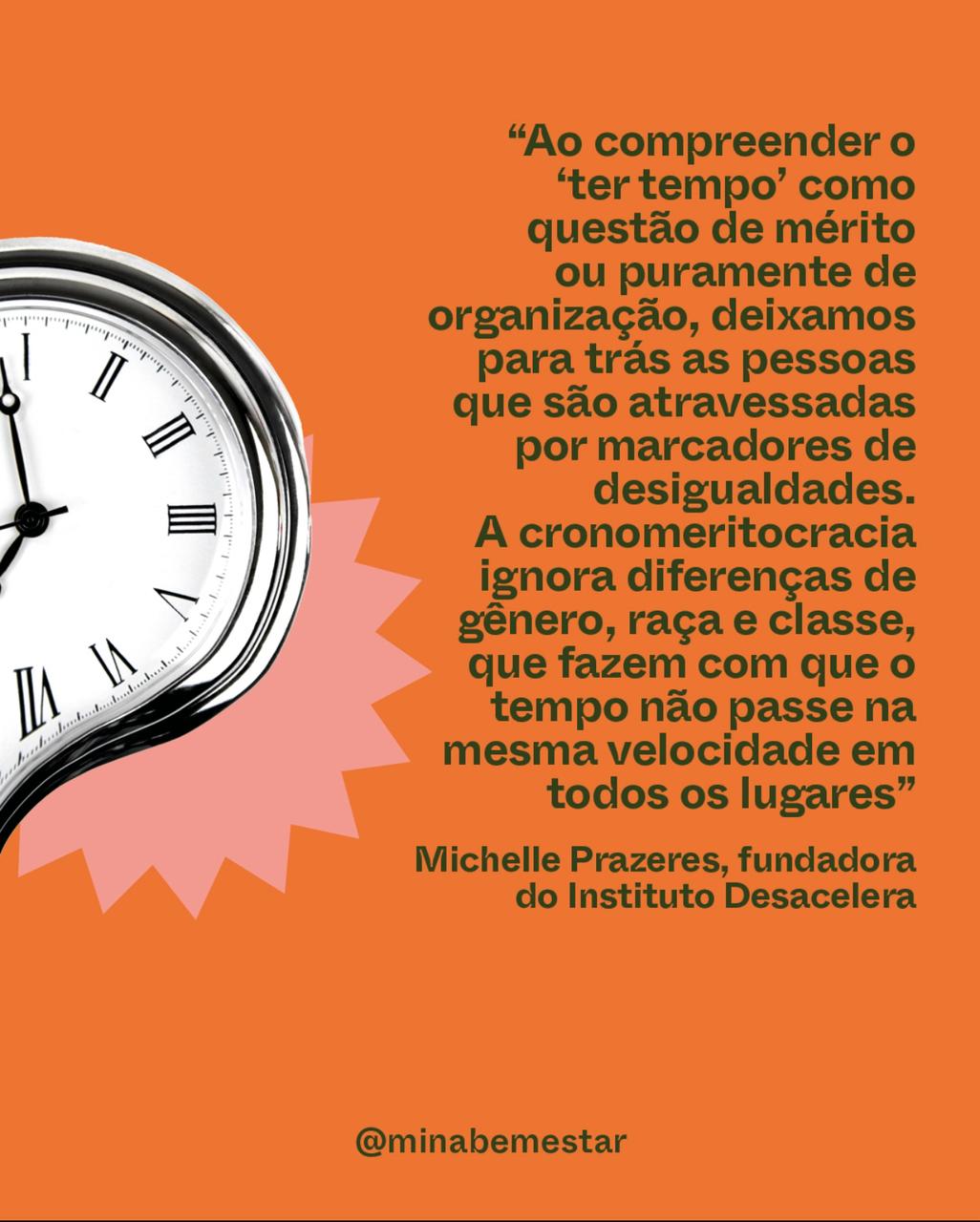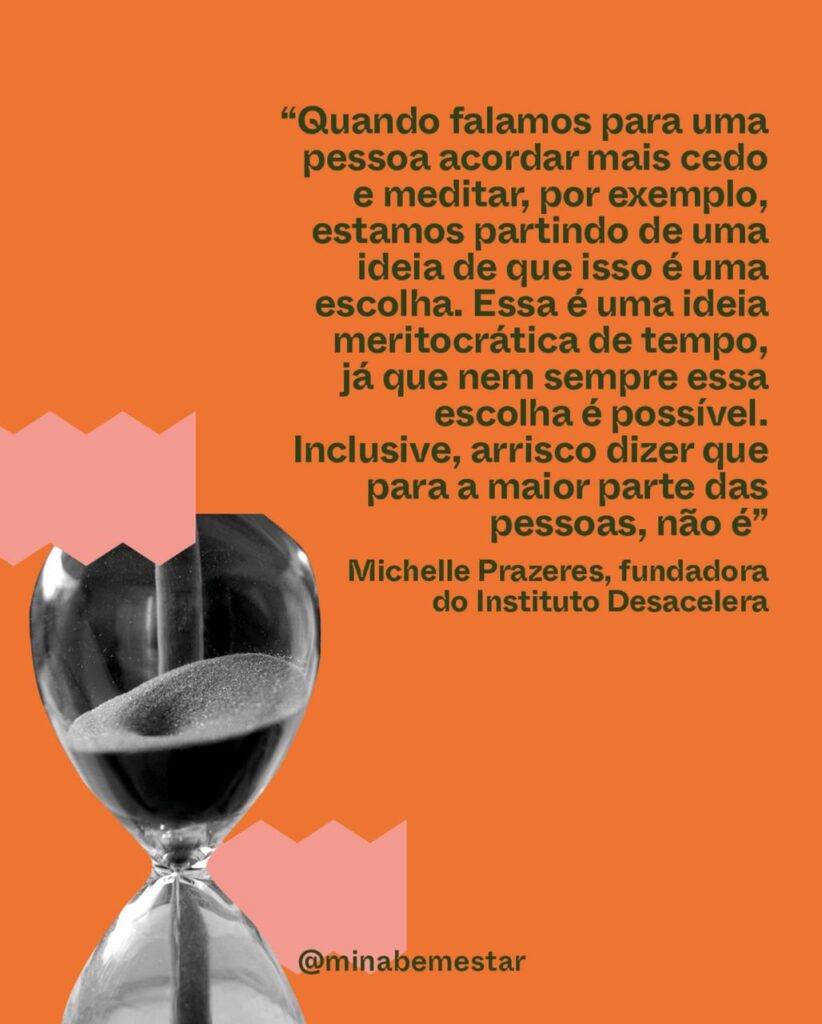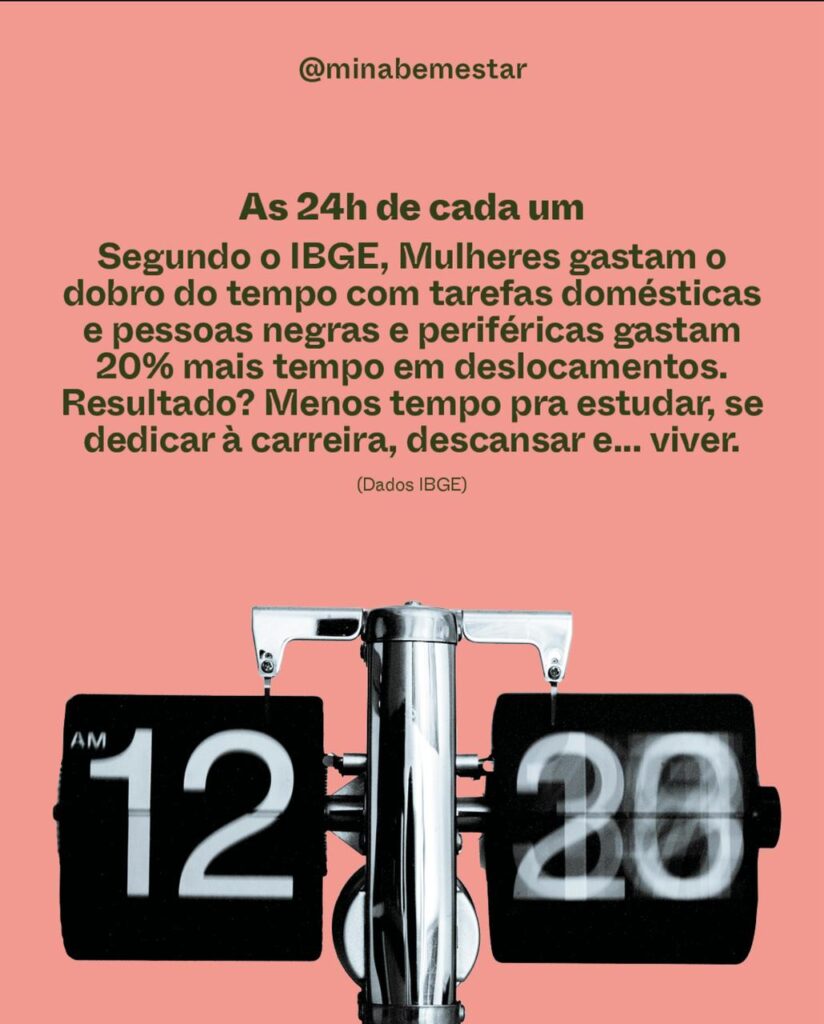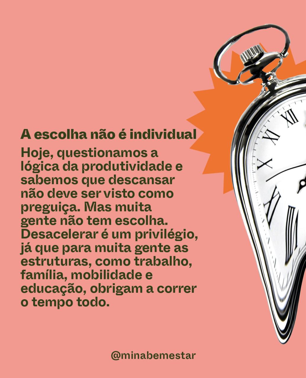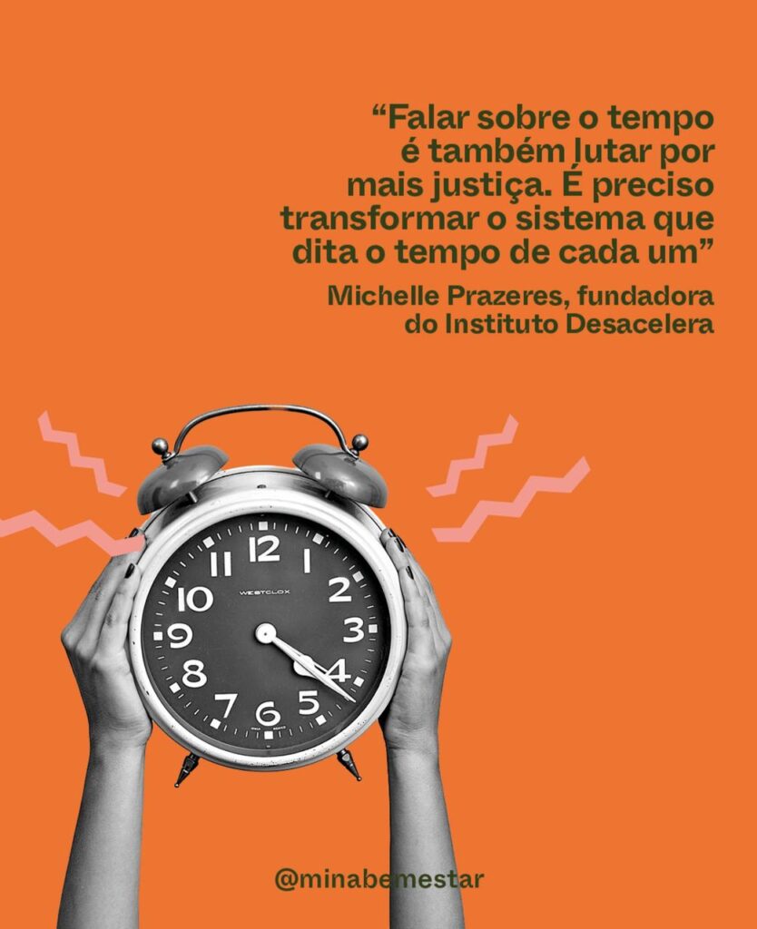 Se você acha que todo mundo tem as mesmas 24 horas, essa postagem é pra você. Muitas vezes desacelerar não é sobre falta de organização ou vontade, e sim sobre ter o tempo sequestrado. Enquanto alguns conseguem parar, cuidar de si e respirar, outros mal conseguem conviver com a família. Michelle Prazeres (@midesacelera), do @institutodesacelera, explica o termo “cronomeritocracia”, e mostra como a cultura da produtividade acaba escondendo desigualdades profundas. A @minabemestar sempre traz a importância da saúde mental, a necessidade de descanso e de qualidade de vida, mas é preciso lembrar que, pra isso, é necessário justiça temporal. Passa pro lado pra entender mais.